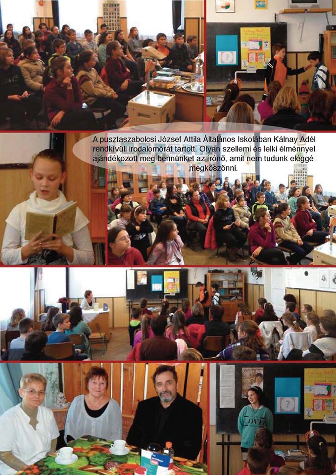 November 23. délután 2 óra. Pusztaszabolcs, József Attila Általános Iskola, Mátyás király utca 14. Találkozó, beszélgetés, felolvasás a Magyar 2-es teremben. Rendhagyó irodalomóra Kálnay Adéllal. Támogató a Szépírók Társasága