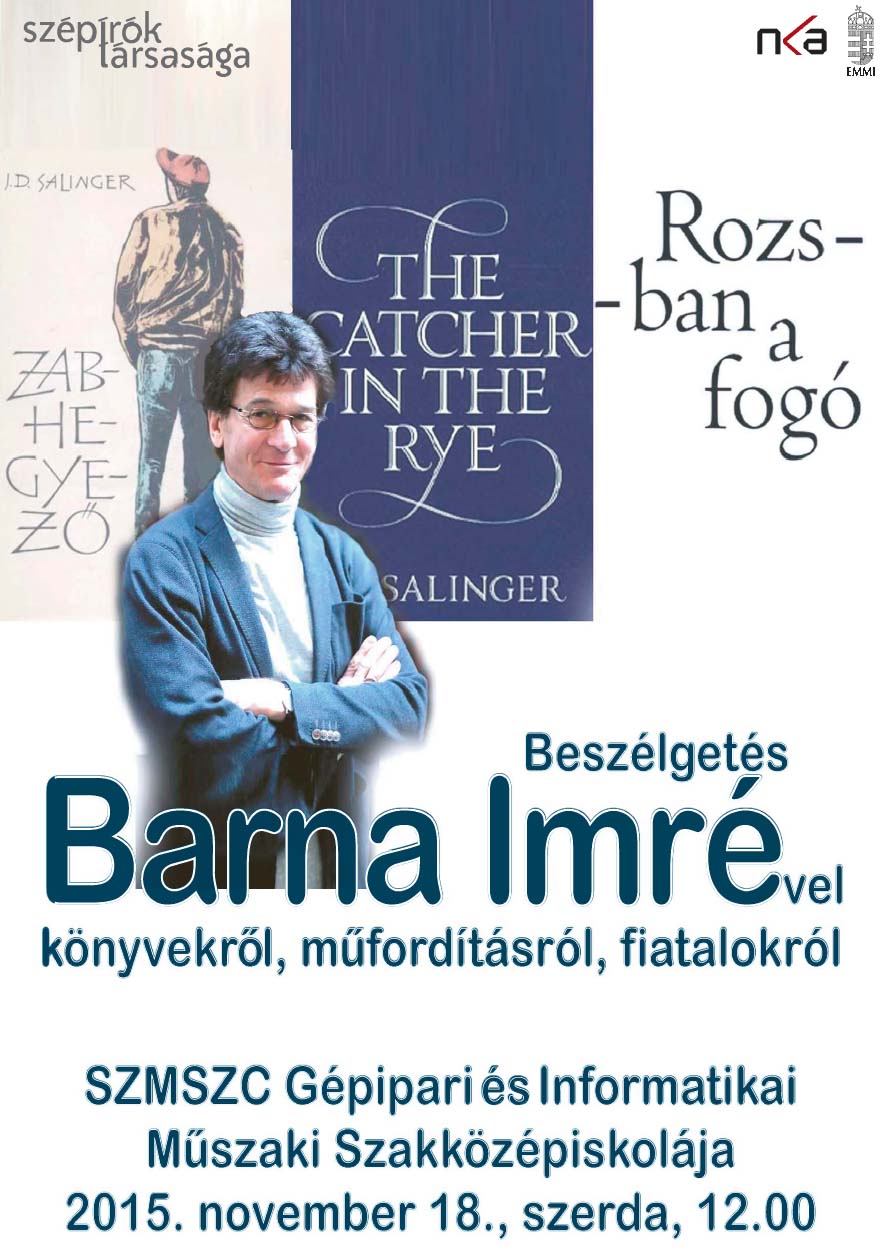November 18. déli 12 óra. Szombathely, SZMSZC Gépipari és Informatikai Műszaki Szakközépiskolája. Rendhagyó irodalomóra. Beszélgetés Barna Imrével könyvekről, műfordításról, fiatalokról. Támogató a Szépírók Társasága