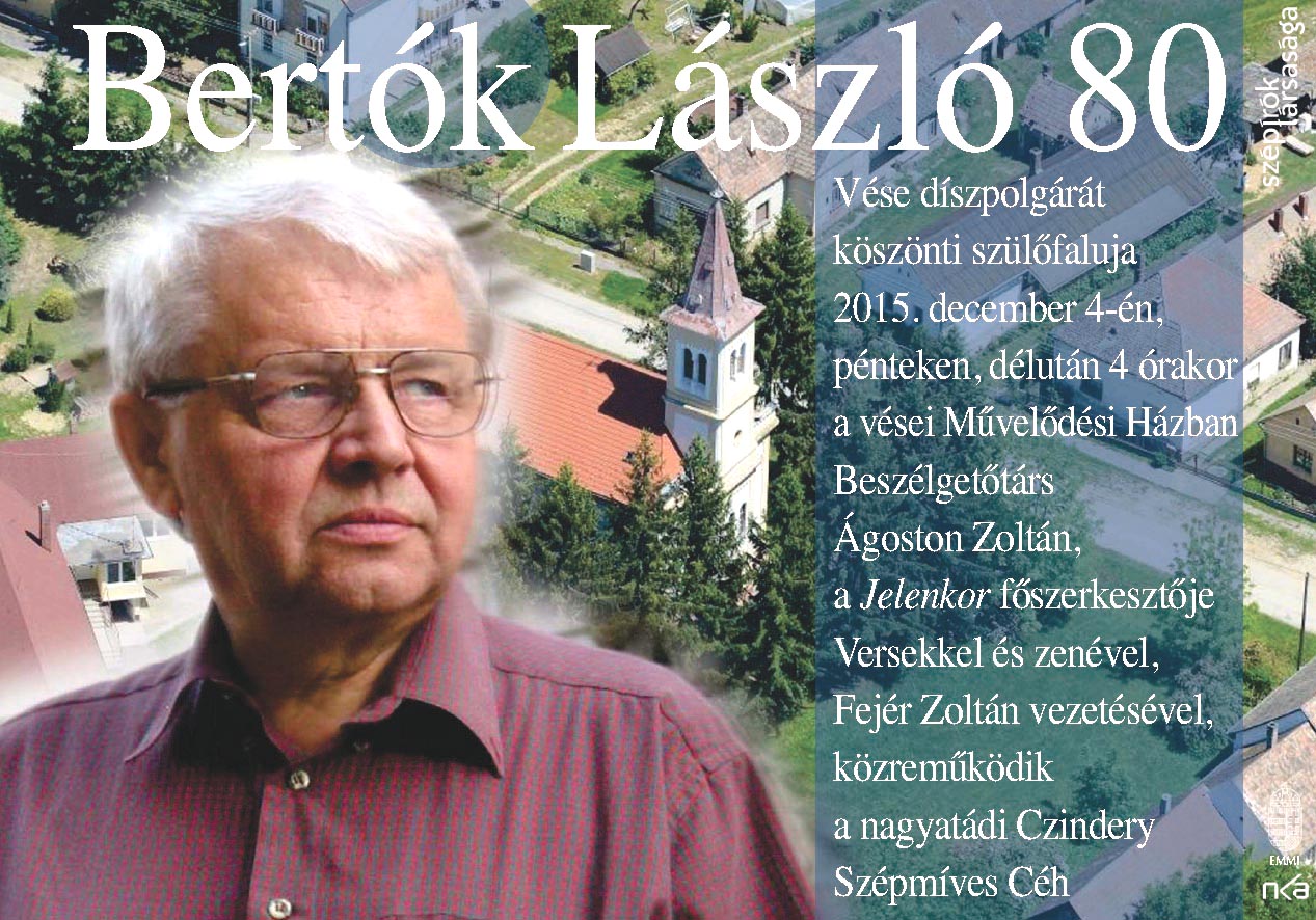 December 4. délután 4 óra. Vése, Művelődési Ház. A 80 éves Bertók Lászlót, Vése díszpolgárát, köszönti szülőfaluja. Beszélgetőtárs Ágoston Zoltán, a Jelenkor főszerkesztője. Versekkel és zenével, Fejér Zoltán vezetésével, közreműködik a nagyatádi Czindery Szépmíves Céh. Támogató a Szépírók Társasága