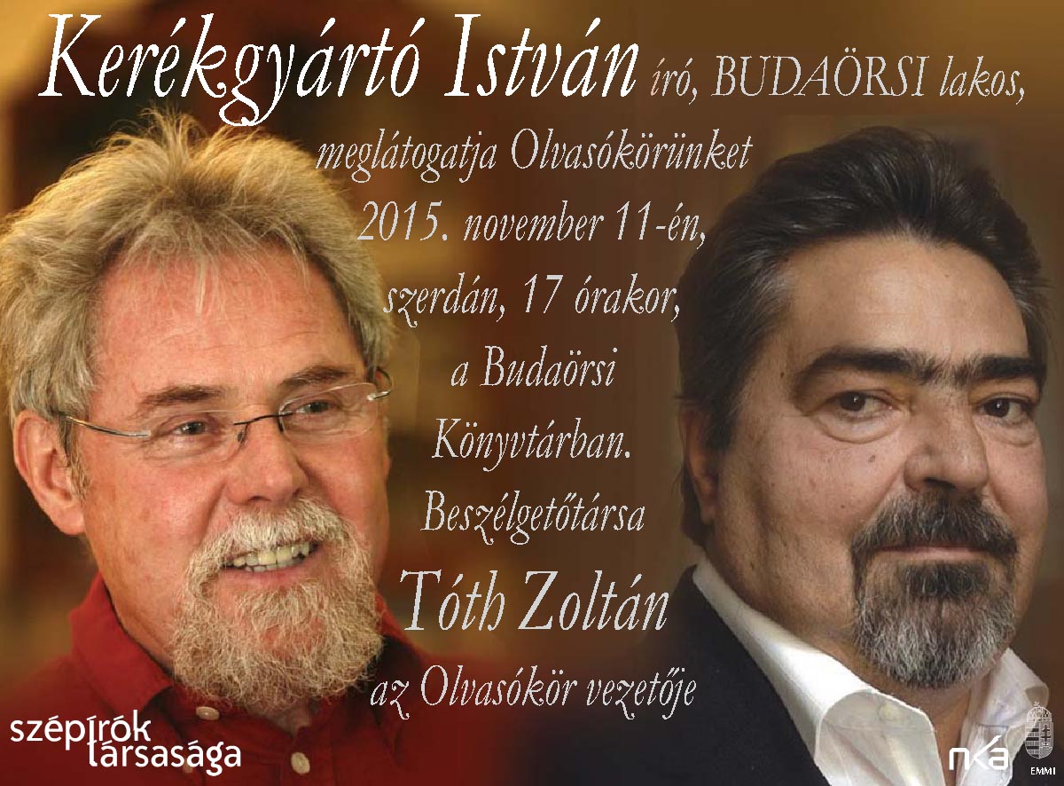 November 11 délután 5 óra. Budaörsi Könyvtár. Kerékgyártó István író, BUDAÖRSI lakos, meglátogatja az Olvasókört. Beszélgetőtársa Tóth Zoltán. Támogató a Szépírók Társasága