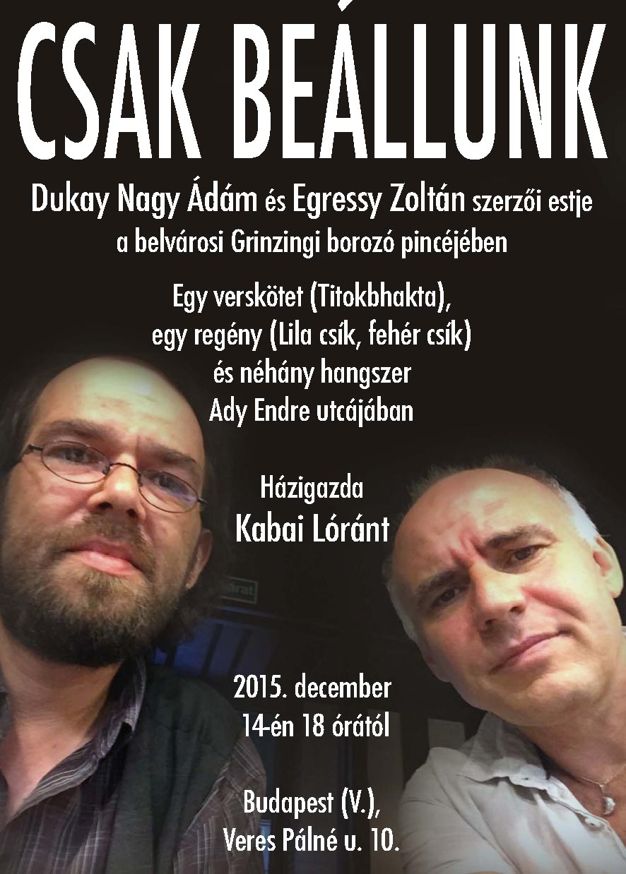 December 14. este 6. Grinzingi borozó pincéje, Bp., V. Veres Pálné u. 5. Csak beállunk. Dukay Nagy Ádám és Egressy Zoltán szerzői estje. Házigazda Kabai Lóránt