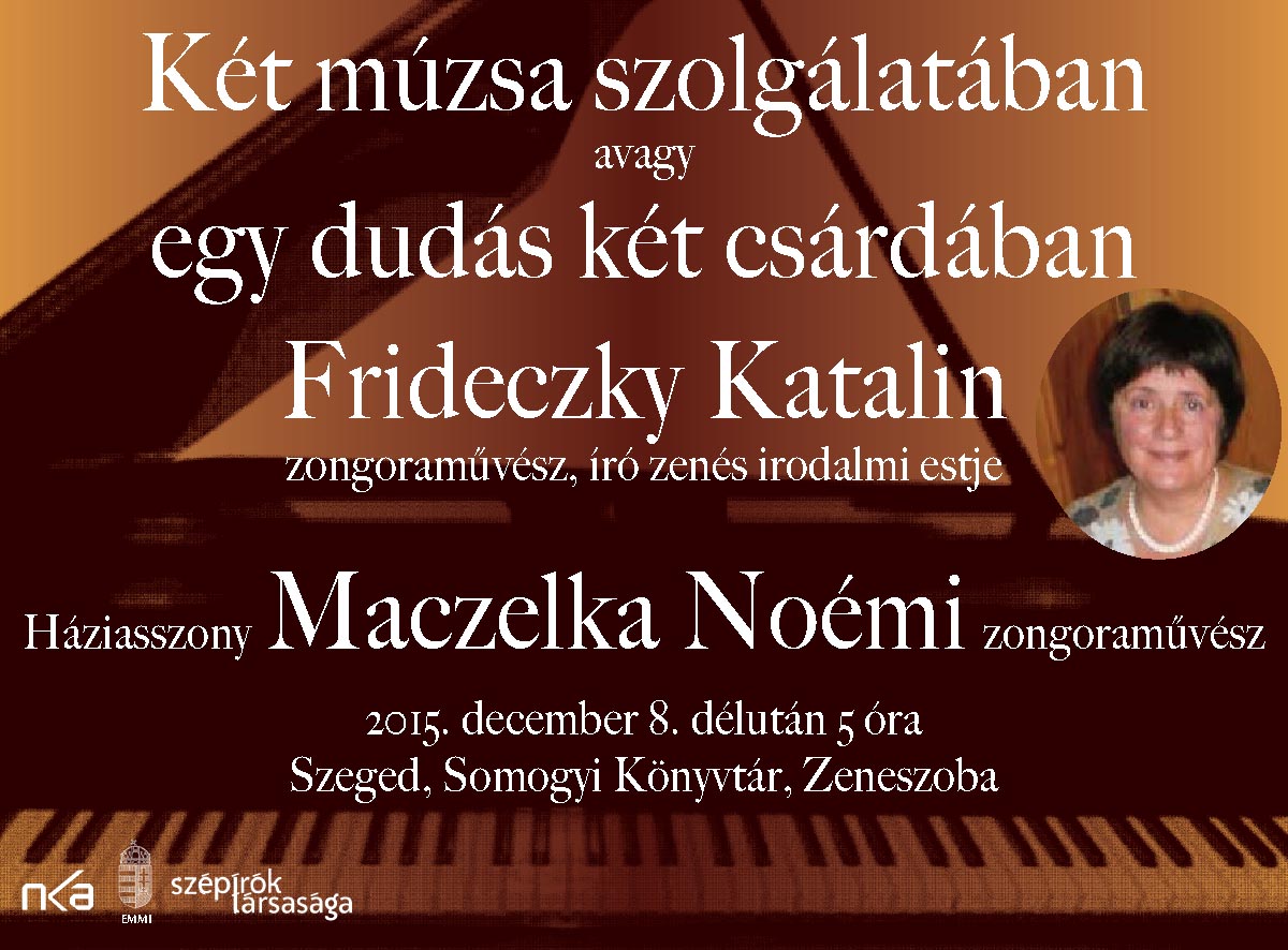 December 8. délután 5 óra. Szeged, Somogyi Könyvtár, Zeneszoba. Két múzsa szolgálatában avagy egy dudás két csárdában. Frideczky Katalin zongoraművész, író zenés irodalmi estje. Háziasszony: Maczelka Noémi zongoraművész