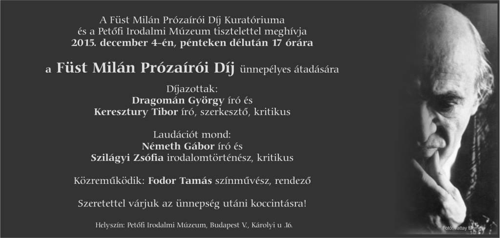 December 4. délután 5 óra. Petőfi Irodalmi Múzeum. Füst Milán Prózaírói Díj ünnepélyes átadására. Díjazottak: Dragomán György és Keresztury Tibor. Laudációt mond Németh Gábor és Szilágyi Zsófia. Közreműködik Fodor Tamás