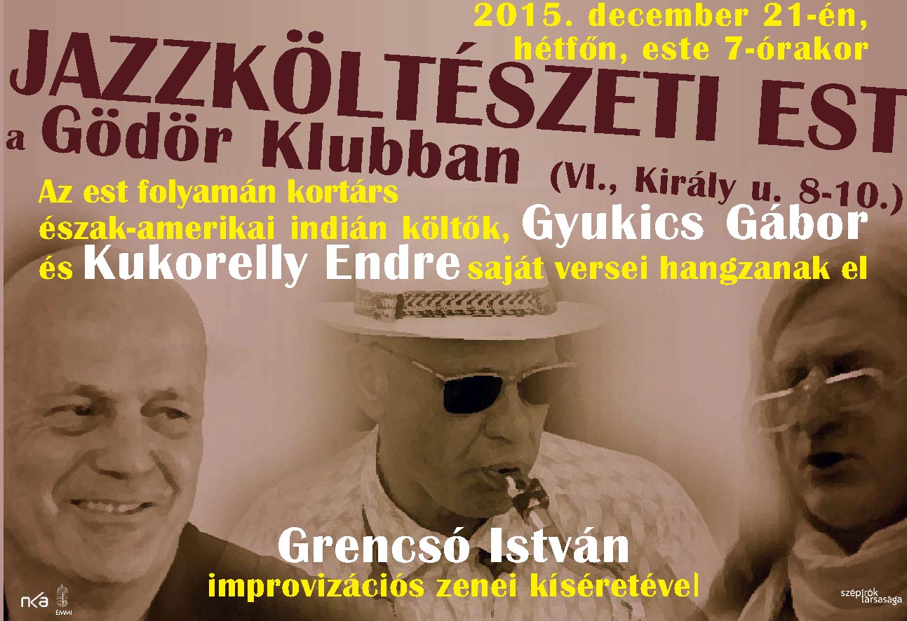 December 21. este 7 óra. Gödör Klub – Central Passage, Király u. 8-10. Jazzköltészeti est Kukorelly Endre, Gyukics Gábor és Grencsó István jazz zenész közreműködésével. Támogató a Szépírók Társasága