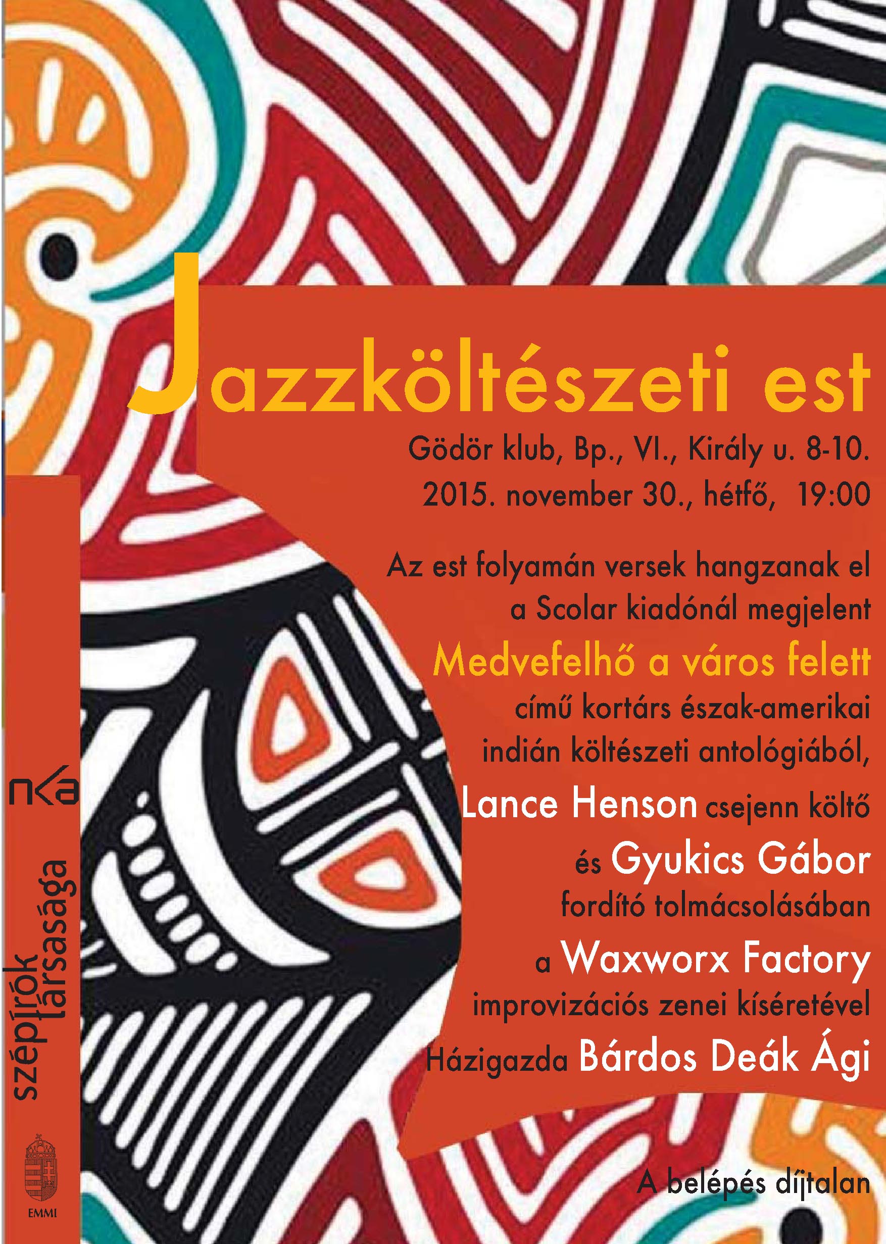 November 30. este 7 óra. Gödör Klub – Central Passage, Király u. 8-10. Jazzköltészeti est Lance Henson amerikai indián költő, Gyukics Gábor költő és a Viaszfiúk együttes közreműködésével. Támogató a Szépírók Társasága