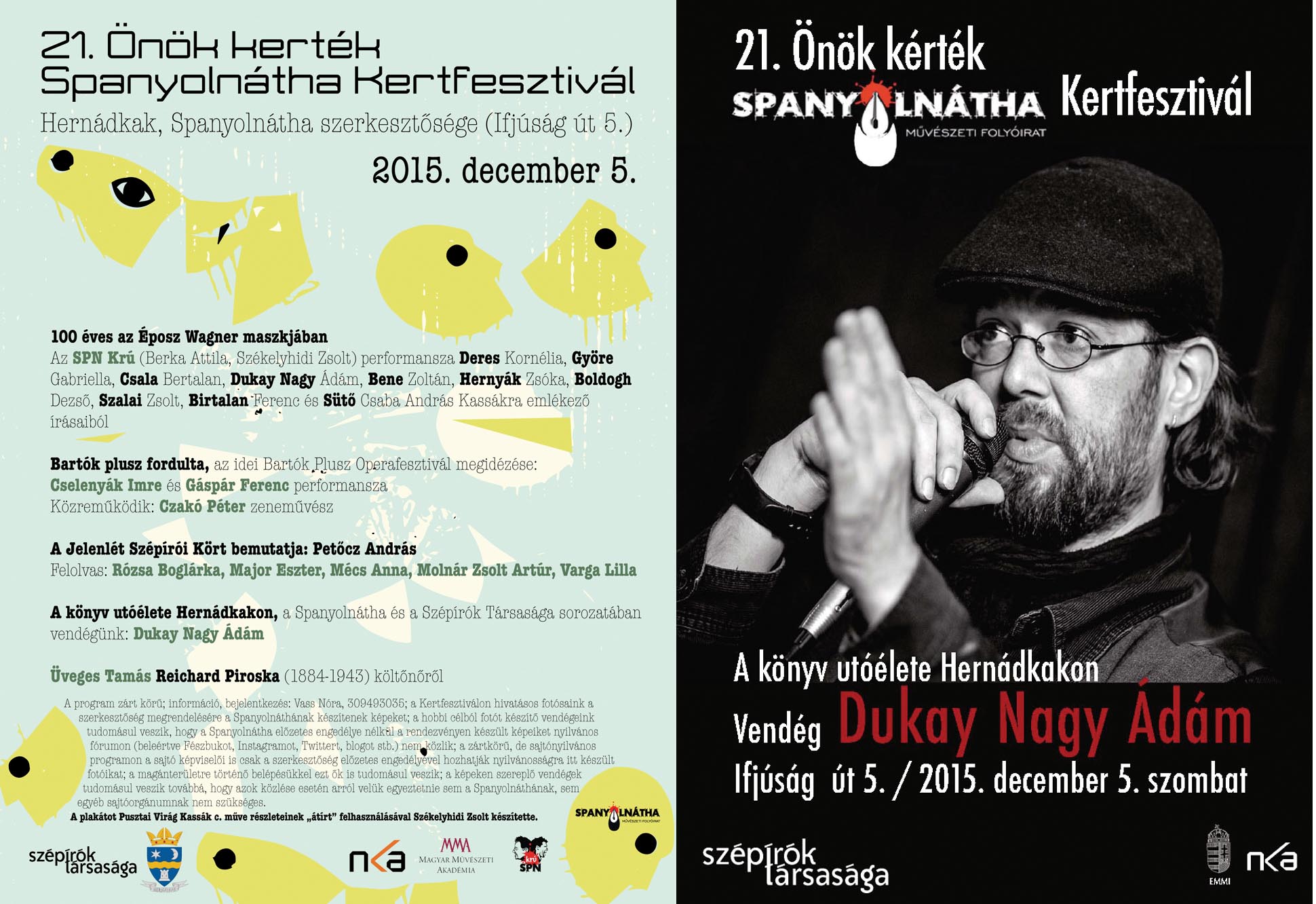 December 5. Hernádkak, Ifjúság út 5. 21. Önök kérté. Spanyolnátha Kertfesztivál. A Szépírók Társaságával közös "A könyv utóélete program vendége Dukay Nagy Ádám.