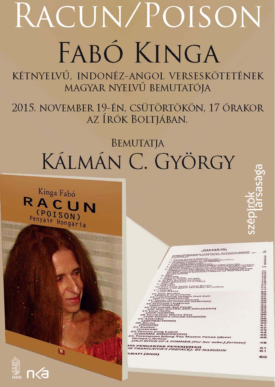 November 19. délután 5 óra. Írók Boltja. Fabó Kinga könyvbemutatója. A kétnyelvű, indonéz-angol verseskötetet (Racun/Poison) bemutatja, és a szerzővel (magyarul) beszélget Kálmán C. György. Támogató a Szépírók Társasága