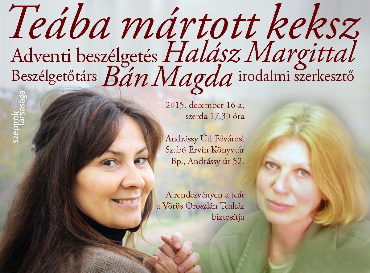 December 16. délután fél 6. Andrássy Úti Fővárosi szabó Ervin Könyvtár, Andrássy út 52. Teába mártott keksz. Adventi beszélgetés Halász margittal. Beszélgetőtárs Bán Magda. A rendezvényen a teát a Vörös Oroszlán Teaház biztosítja