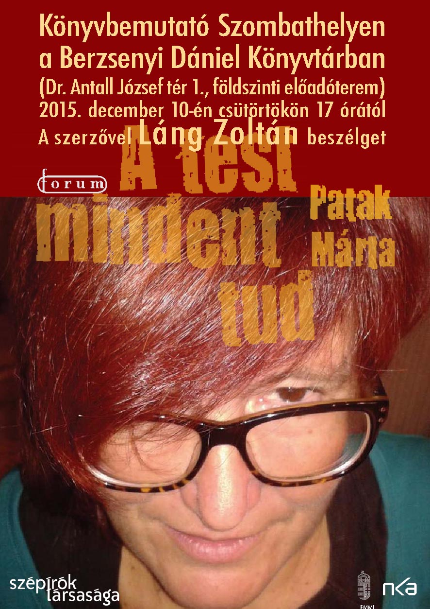 December 10. délután 5 óra. Szombathely, Berzsenyi Dániel Könyvtár. Patak Márta A test mindent tud című kötetének bemutatója. A szerzővel beszélget Láng Zoltán. Támogató a Szépírók Társasága