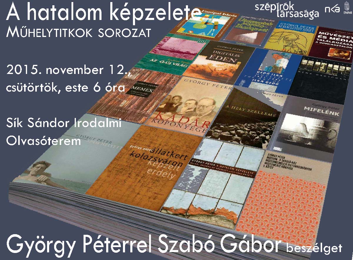 November 12. este 6 óra. Szegedei Egyetem, Sík Sándor Olvasóterem. A hatalom képzelete. A Műhelytitkok sorozatban György Péterrel Szabó Gábor beszélget. Támogató a Szépírók Társasága