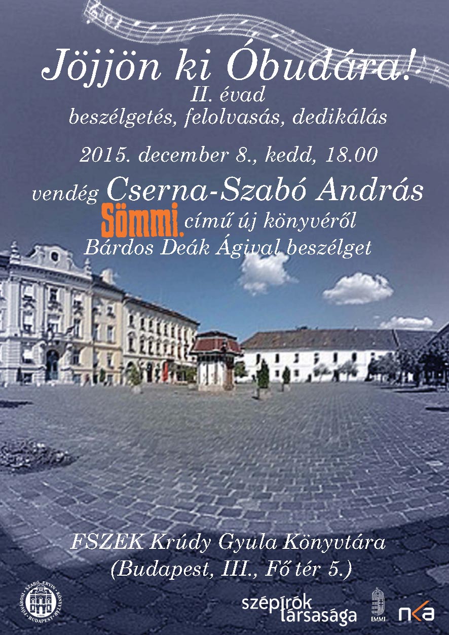 November 12. este 6 óra. Óbuda, Krúdy Gyula Könyvtár, Fő tér. Jöjjön ki Óbudára, hogy találkozzon Cserna-Szabó Andrással, akivel nemrég megjelent Sömmi című könyvéről Bárdos Deák Ági beszélget. Támogató a Szépírók Társasága