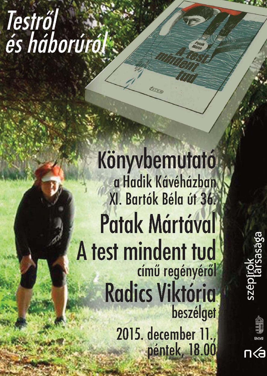 December 11., este 6 óra óra. Hadik Kávéház, XI. Bartók Béla út 36. Testről és háborúról. Patak Mártával Radics Viktória beszélget A test mindent tud című regényéről. Támogató a Szépírók Társasága