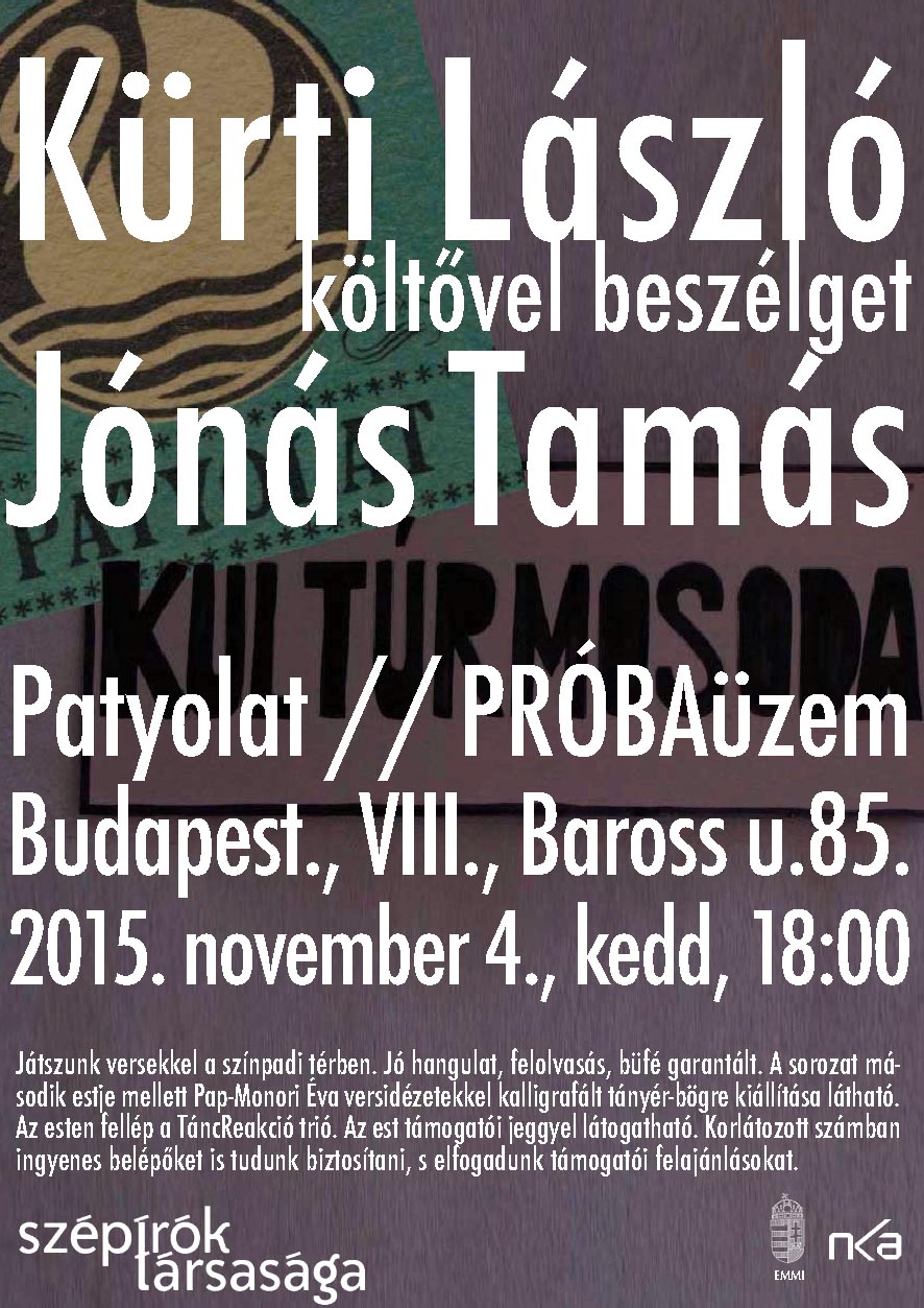 November 3. este 6 óra. Patyolat//PRÓBAaüzem, Baross u. 85. Jónás Tamás sorozata. Versbeállítás Kürti Lászlóval. Beszélgetünk, s játsszunk versekkel a színpadi térben. Jó hangulat, felolvasás. A sorozat második estje mellett Pap-Monori Éva versidézetekkel kalligrafált tányér-bögre kiállítása látható. Az esten fellép a TáncReakció trió. Támogató a Szépírók Társasága