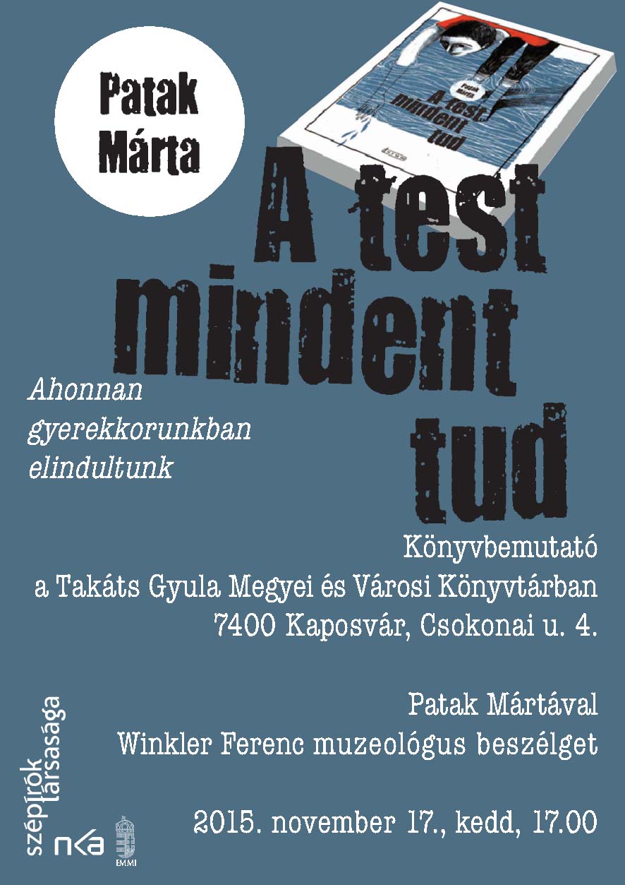 November 17. délután 5 óra. Takáts Gyula Megyei és Városi Könyvtár, Kaposvár, Csokonai u. 4. Ahonnan gyerekkorunkban elindultunk. Patak Márta A test mindent tud című regényéről Winkler Ferenc muzeológus beszélget a szerzővel. Támogató a Szépírók Társasága