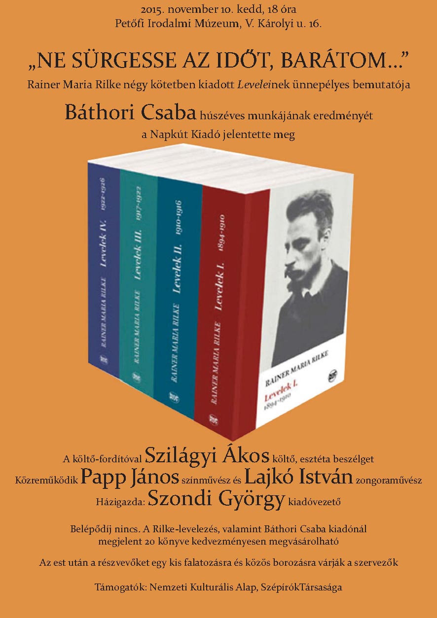 November 10. este 6 óra. Petőfi Irodalmi Múzeum. R. M. Rilke 4 kötetben kiadott levelezésének bemutatója – a Napkút Kiadó rendezvénye. Báthori Csaba fordító beszélgetőtársa Szilágyi Ákos. Az est házigazdája Szondi György kiadóigazgató. Támogató a Szépírók Társasága