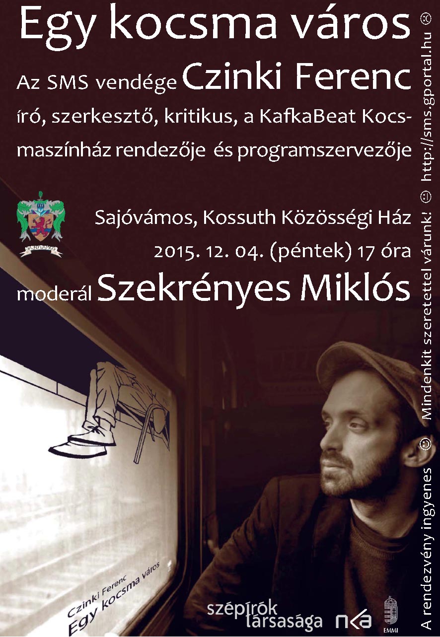 December 4, délután 5 óra. Sajóvámos, Kossuth Közösségi Ház. „Egy kocsma város”. Az SMS vendége Czinki Ferenc író, szerkesztő, kritikus, a KafkaBeat Kocsmaszínház rendezője és programszervezője. Beszélgetőtársa: Szekrényes Miklós. A rendezvény ingyenes. Mindenkit szeretettel várunk! http://sms.gportal.hu