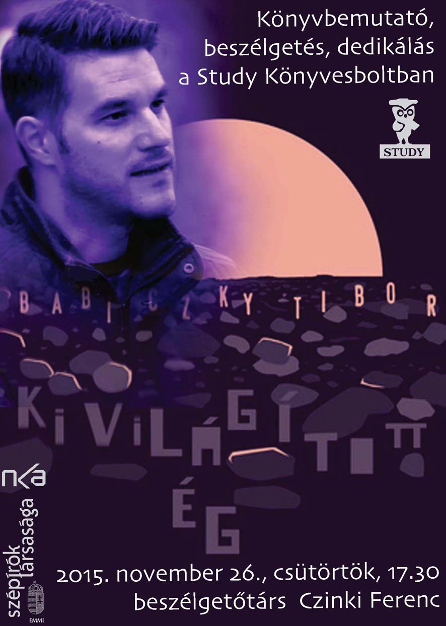 November 26. délután fél 6. Székesfehérvár, Study Könyvesbolt. Babiczky Tibor Kivilágított ég c. kötetét bemutatja, és a szerzővel beszélget Czinki Ferenc. Támogató a Szépírók Társasága