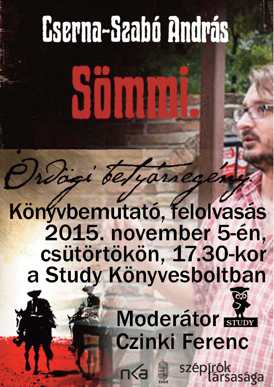 November 5. este fél 6. Székesfehérvár, Study Könyvesbolt. Cserna-Szabó András Sömmi c. kötetének bemutatója. A könyvet bemutatja, és a szerzővel beszélget Czinki Ferenc. Házigazda Csada Ferenc. Támogató a Szépírók Társaság