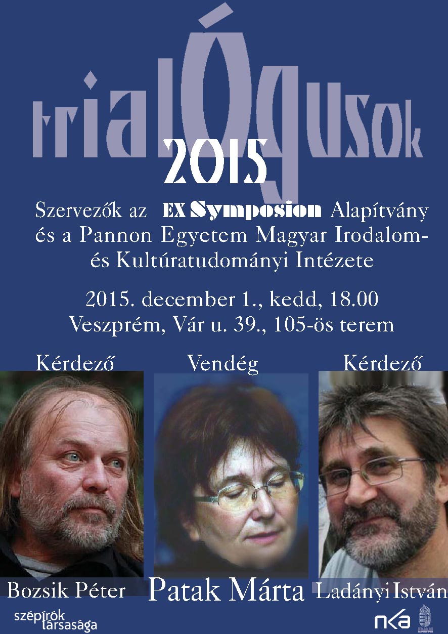 December 1. este 6 óra. Pannon Egyetem, Irodalom- és Kultúratudományi Intézet, Veszprém, Vár u. 39., 105-ös terem. Trialógusok 2015. Szervezők: az Ex Symposion Alapítvány és a Pannon Egyetem Irodalom- és Kultúratudományi Intézete. Vendég: Patak Márta. Kérdezők: Bozsik Péter, Ladányi István. Támogató a Szépírók Társasága