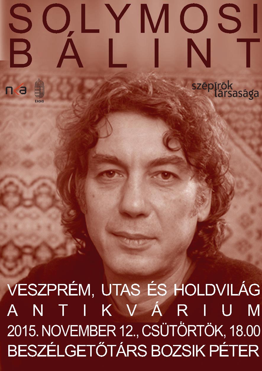 November 12. este 6 óra. Veszprém, Utas és Holdvilág antikvárium. Solymosi Bálint irodalmi estje. Beszélgetőtársa Bozsik Péter. Házigazda Molnár Sándor. Támogató a Szépírók Társasága