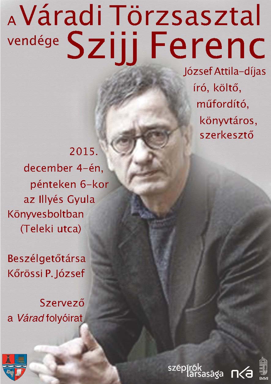 December 4. este 6 óra. Nagyvárad, Illyés Gyula Könyvesbolt. A Váradi Törzsasztal vendége Szijj ferenc. Beszélgetőtársa Kőrössi P. József. Szervező a Várad folyóirat. Támogató a Szépírók Társasága