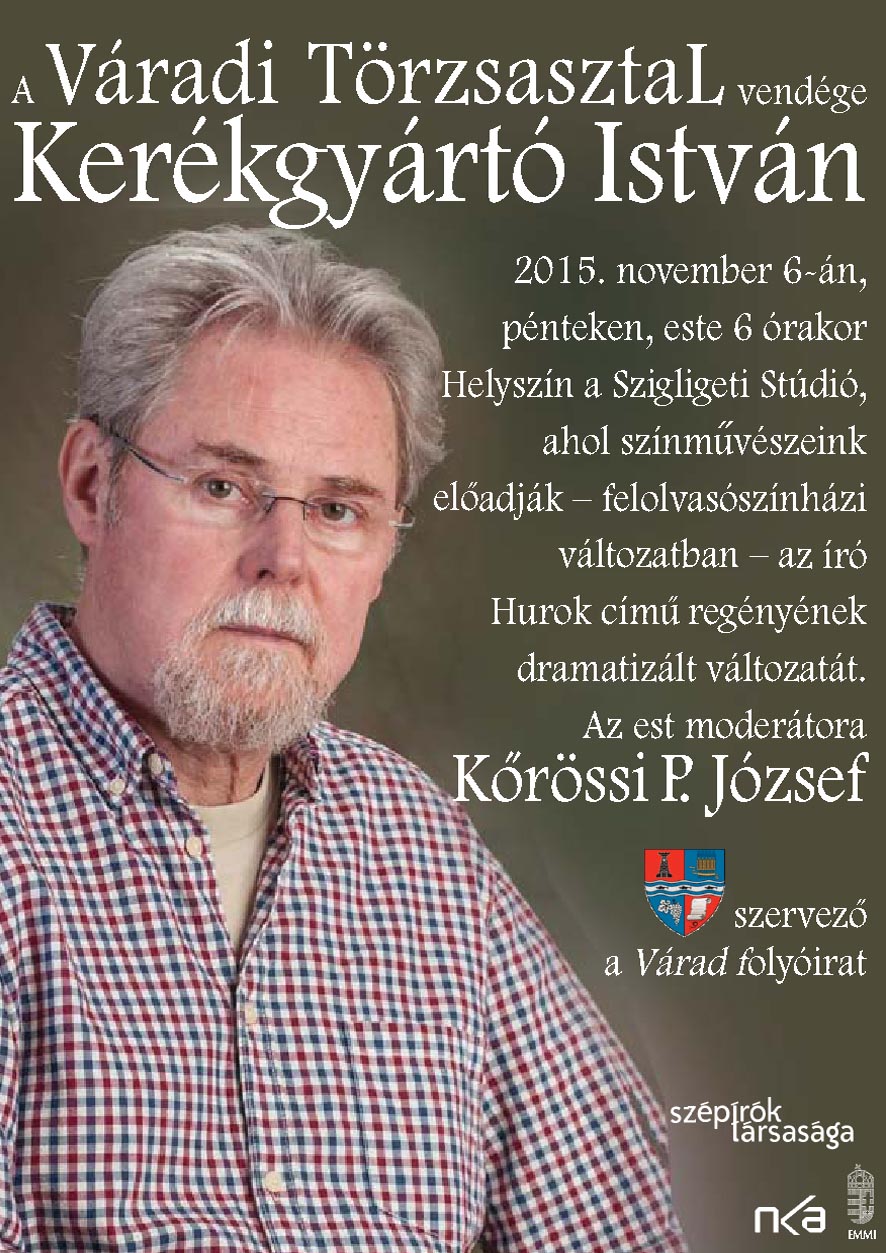 November 6. este 6 óra. Nagyvárad, Illyés Gyula Könyvesbolt. A Váradi Törzsasztal vendége Kerékgyártó István. Beszélgetőtársa Kőrössi P. József. Szervező a Várad folyóirat. Támogató a Szépírók Társasága