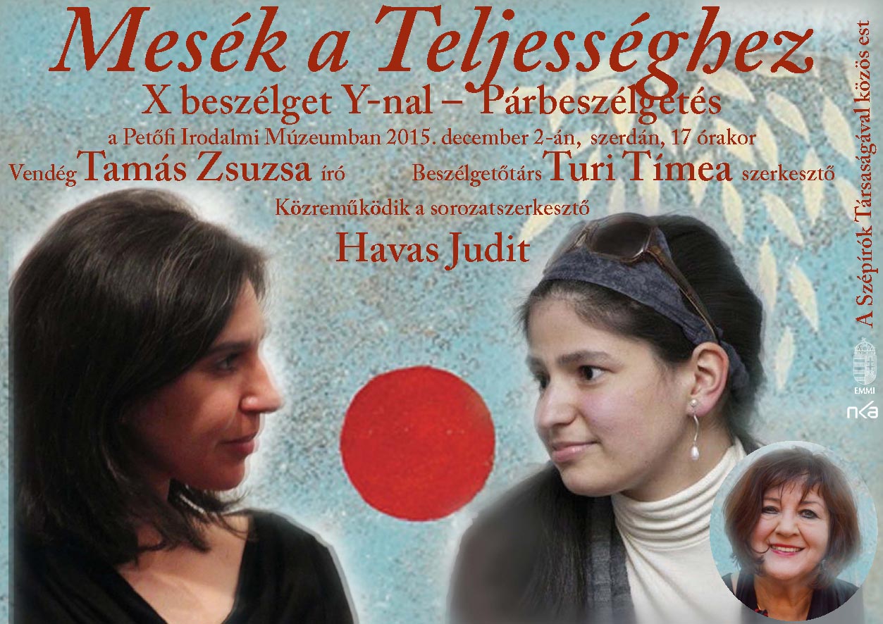 December 2. délután 5 óra. Petőfi irodalmi Múzeum. X beszélget Y-nal. Párbeszélgetés. Mesék a Teljességhez. Vendég Tamás Zsuzsa író. Beszélgetőtárs Turi Timea szerkesztő. Közreműködik a sorozatszerkesztő Havas Judit. A Szépírók Társaságával közös est