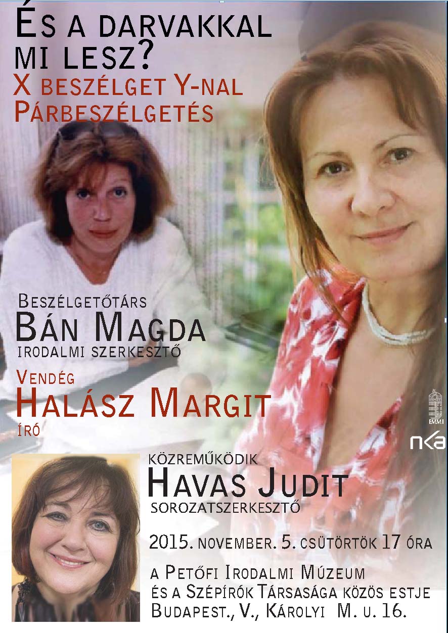 November 5. este 6 óra. Petőfi Irodalmi Múzeum. X beszélget Y-nal. Párbeszélgetés És a darvakkal mi lesz? Vendég: Halász Margit író. Beszélgetőtársa:Bán Magda irodalmi szerkesztő. Sorozatszerkesztő és közreműködik Havas Judit. A Szépírók Társaságával közös est