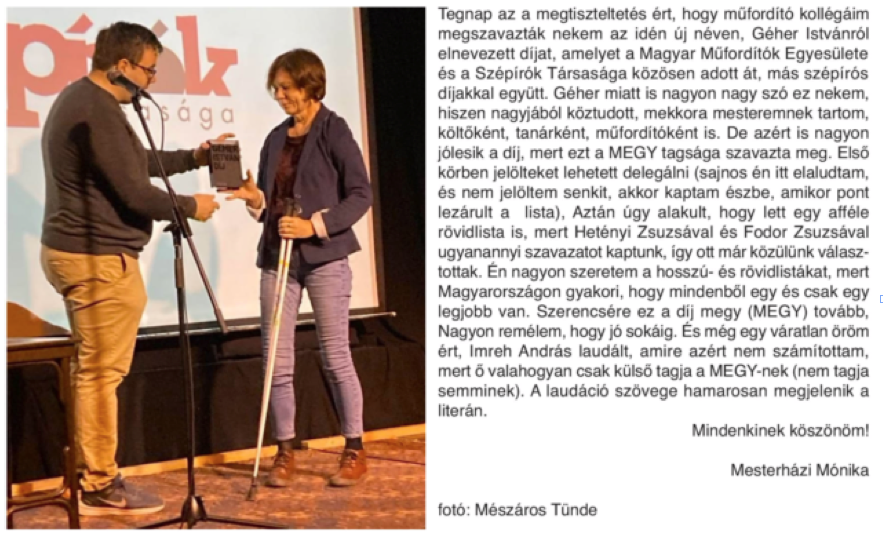 Kéri Piroska-díjazott  irodalomszervezői munkájáért Jenei László, laudálta: Barcsai László